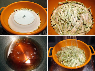 – Descasque as berinjelas e corte em fatias e depois em palitos finos.