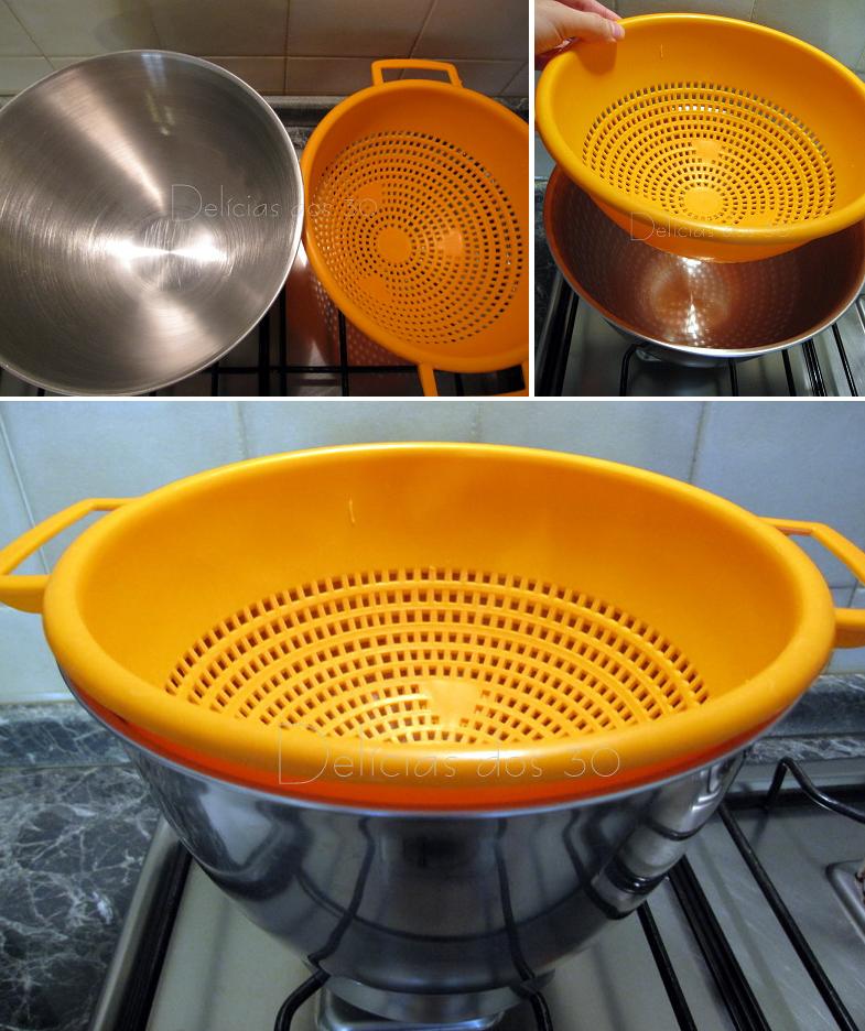 – As berinjelas precisam perder líquido, por isso, coloque um escorredor de macarrão, ou uma peneira grande, dentro de uma vasilha, sem que tocasse o fundo dela. Sairá bastante líquido da berinjela, que não deve encostar no fundo do escorredor.